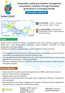 Sustain-COAST “Sustainable coastal groundwater management and pollution reduction through innovative governance in a changing climate” is an R&I project co-funded under the PRIMA 2018 programme section II, for a period of 3 years starting from June 2019. Sustain-COAST consortium is led by the Technical University of Crete (TUC) and is composed of a multidisciplinary team of seven partners from six countries. Sustain-COAST intends to develop a calibrated multi-criteria decision supporting system (DSS) and a web Geographical Information System platform accessible for water stakeholders and policy makers.